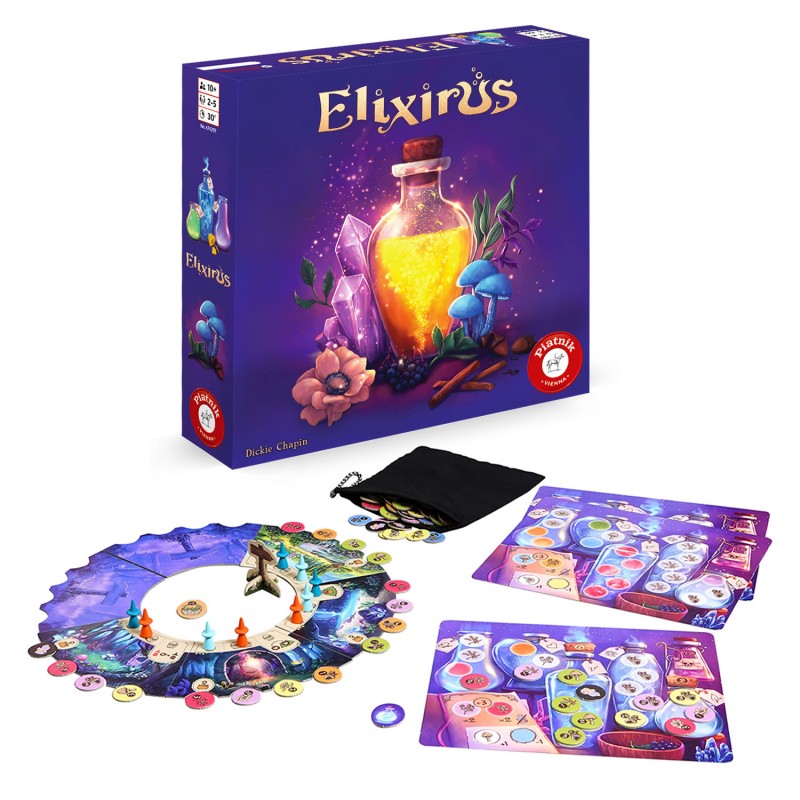 Elixirus este un joc tactic de familie in care jucatorii trimit ucenici in padure pentru a colecta ingrediente valoroase. Cu acestea prepara potiuni, castiga puncte si folosesc efecte speciale. Strategie, planificare si putina magie decid cine devine alchimistul castigator.